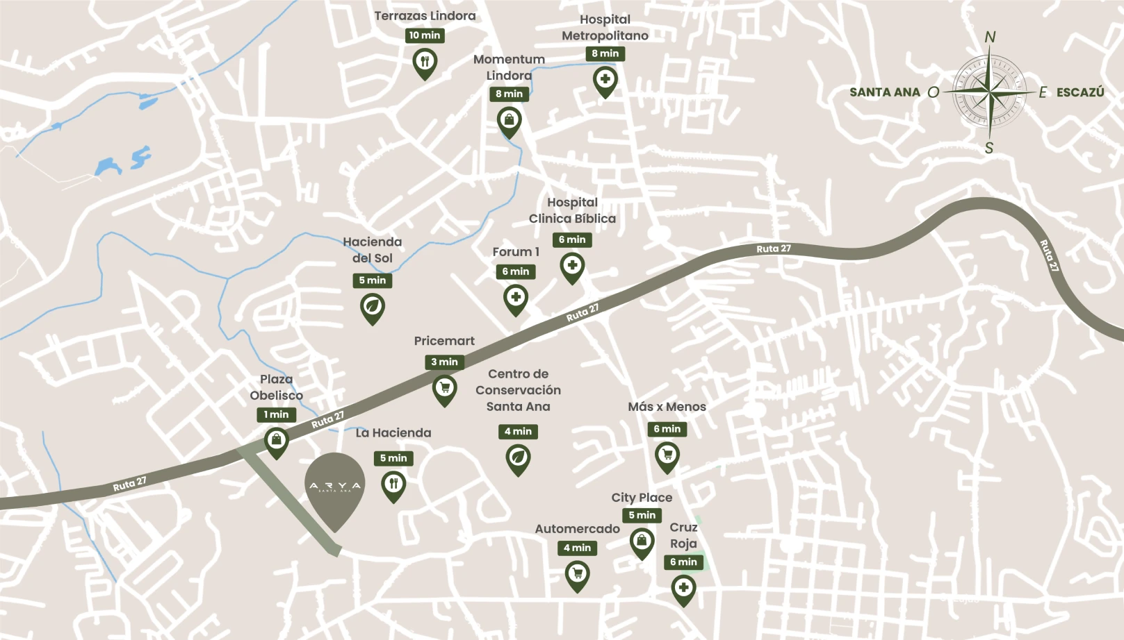 La ubicación de ARYA Santa Ana es clave, a solo 400 metros de Plaza Obelisco y con acceso directo a la Ruta 27, conectando rápidamente con Escazú, San José y áreas cercanas. Vivir en Santa Ana ofrece cercanía a centros comerciales, escuelas y más, sin perder la tranquilidad de un entorno natural. Ideal para quienes buscan un estilo de vida urbano en Santa Ana con acceso a la comodidad de la vida moderna.